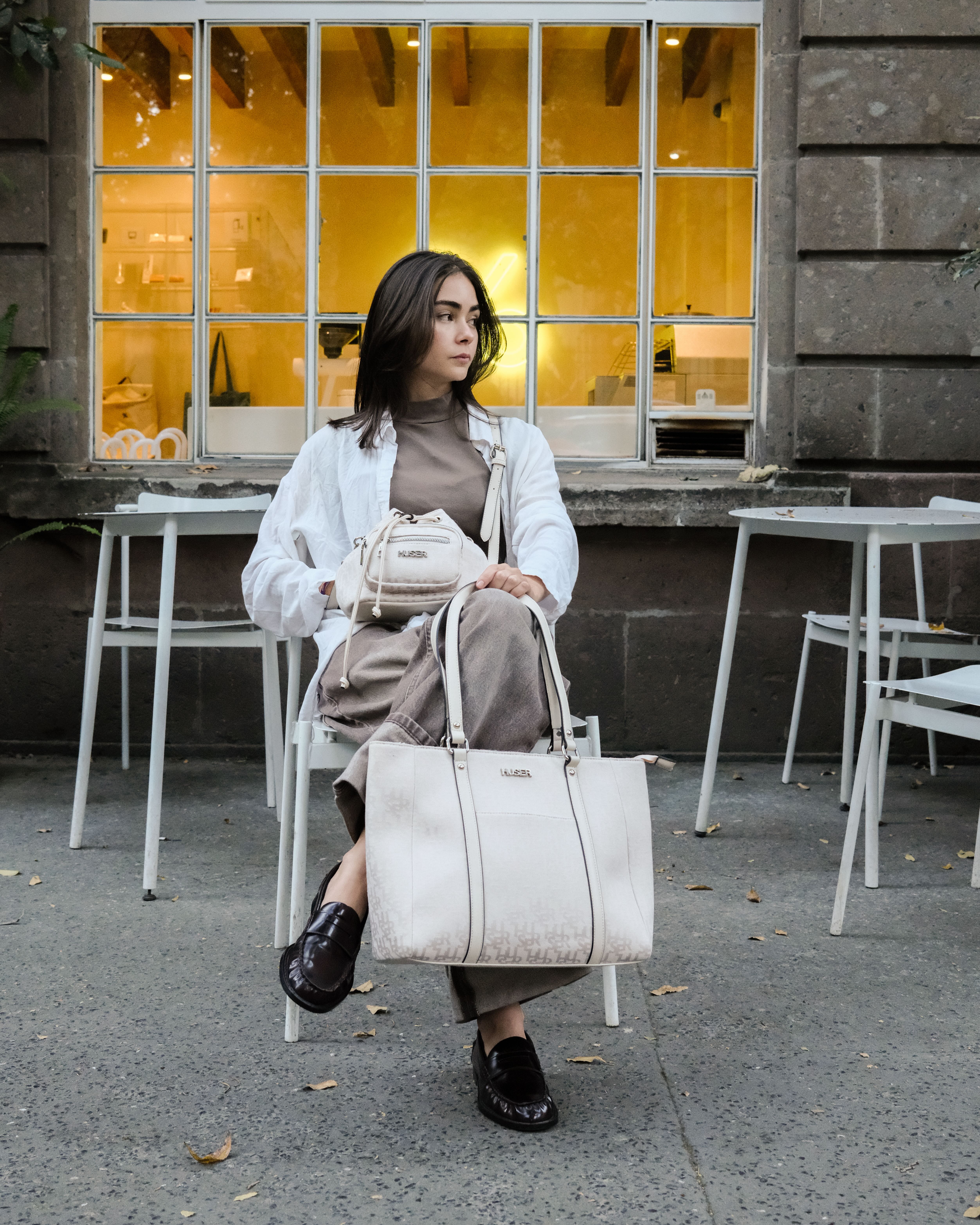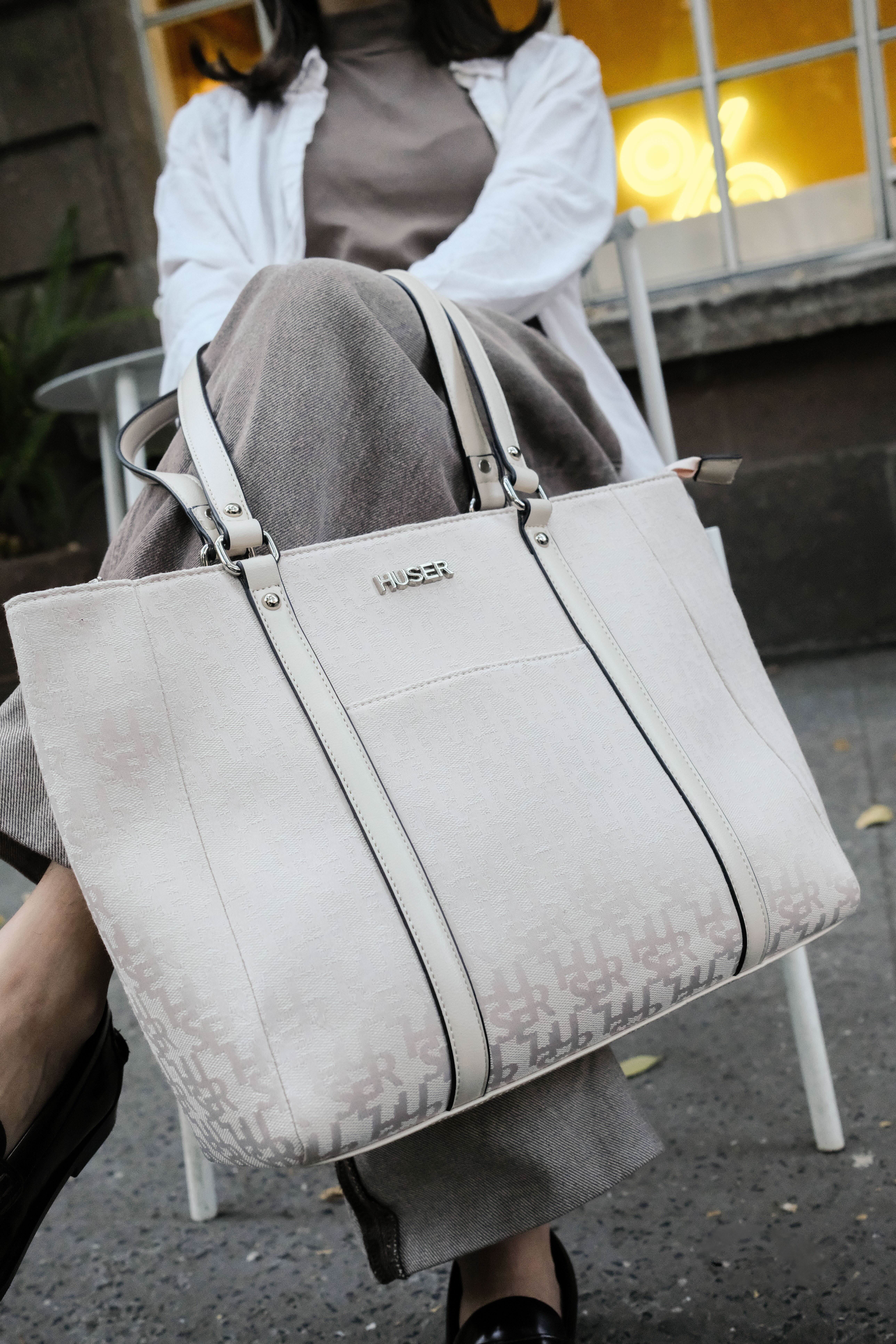DUO EN TELA JACQUARD MONOGRAMA HUSER. BOLSA TOTE Y MORRAL CHICO